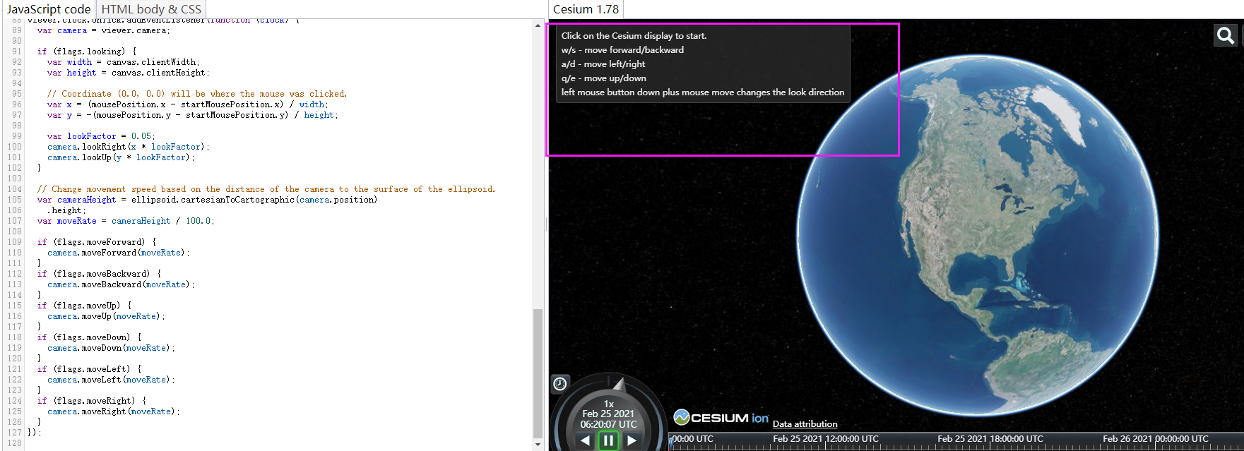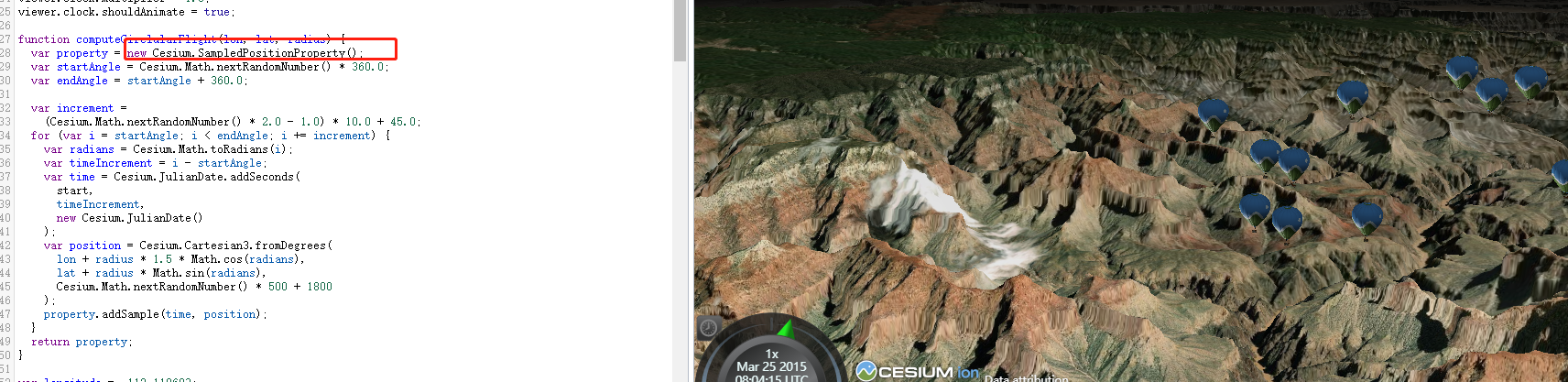 值得注意的是,这里面的entity对象中的position使用了Cesium.SampledPositionProperty,使用这个可以设置某个时间点,entity所在的位置,所以该实例中的entity随时间变化位置也在变化。