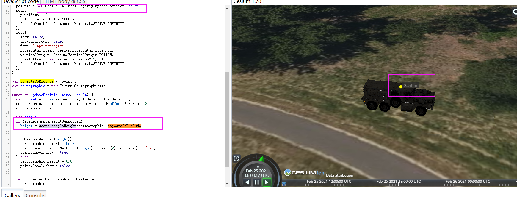 57、使用entity加载点,并且位置属性使用callback函数,动态改变位置,改变位置的过程中,计算贴地的高度。scene.sampleHeight返回给定制位置处场景几何的高度,如果没有则返回 undefined。