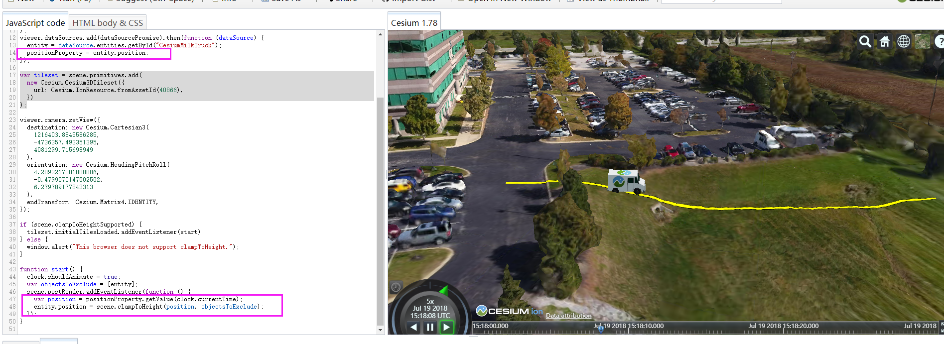 58、使用czml的方式加载模型,并且让模型贴着3dtiles行驶,方法给上一个例子很类似,都是计算了高度再赋值位置属性。