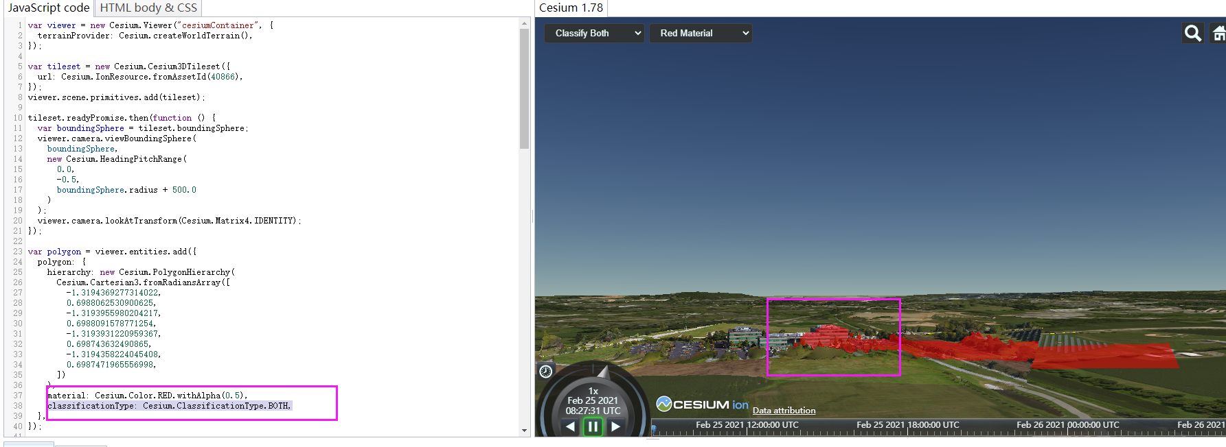 60、设置entity是否覆盖在3dtileset上,通过设置classificationType: Cesium.ClassificationType.BOTH (之前也有例子有讲到过)