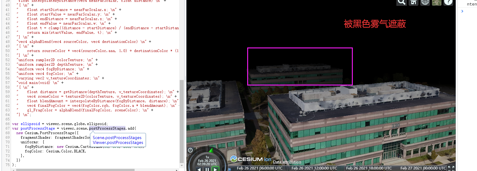 75、雾的效果,通过postProcessStages创建一个后处理阶段,通过加入自定义着色器,去实现3dtileset被雾遮蔽的效果。