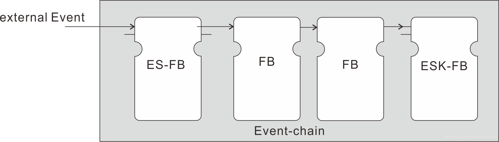 有了ES-FB和ESK 的概念,我们来定义事件链。事件链是从某个ES-FB 产生事件到ESK 的FB 执行链。