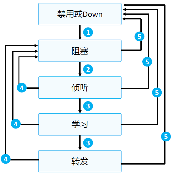 | 转发(Forwarding) | 处于该状态的接口可以正常地收发业务数据帧,也会进行BPDU处理。接口的角色需是根接口或指定接口才能进入转发状态(Root Port、Designated port) |