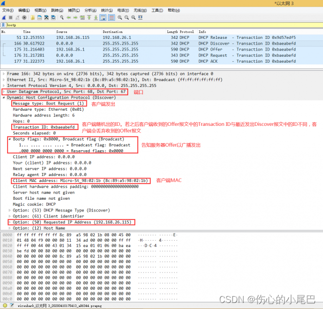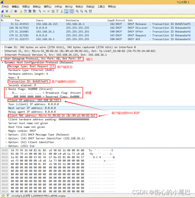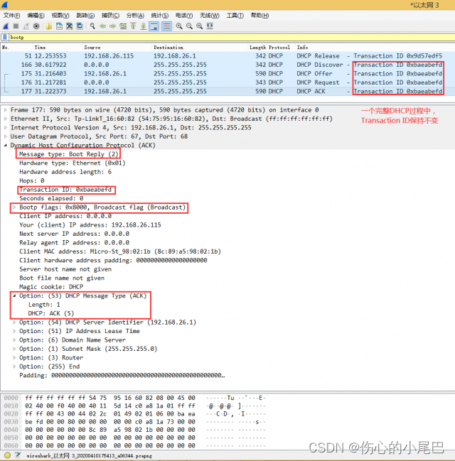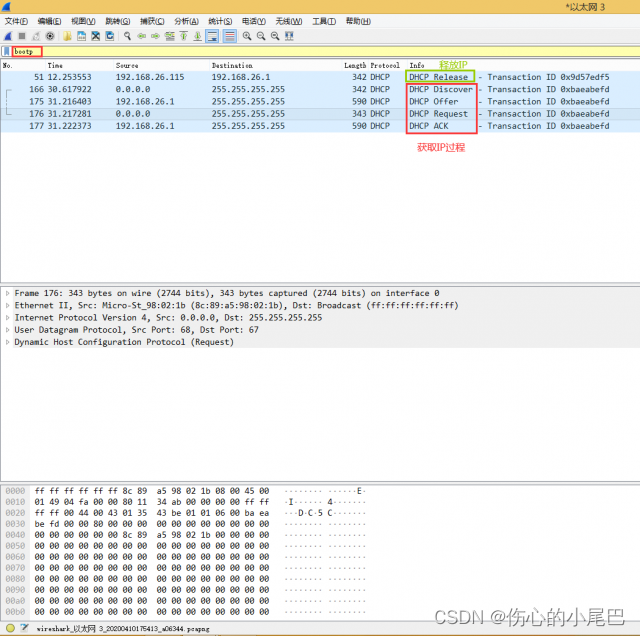 39、通过在Wireshark的Packet Details面板中对捕获的DHCP协议各阶段数据包进行分析