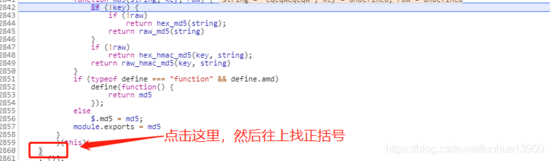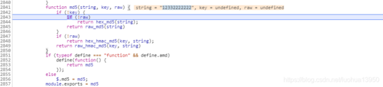 }可以看出md5方法一共有三个参数,第一个 striing 即为密码, key 和 raw 是 undefined。接下笨一点的办法就是一步一步运行,把跳转的所有代码都扣下来,如果是刚开始学习抠代码,这个方法能增加很多调试”感觉”,慢慢抠得越来越顺手。取巧一点的无非就是找到大括号: