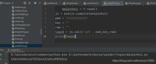 这样里面的代码其实就是本次要抠的代码,但是要使用 python 调用,还要进行一点改动。本次要抠的加密代码其实很简单,毕竟只是 md5 。经过稍微改写后,我们尝试使用python里 execjs 库执行: