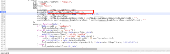 图中的 loginName 为你输入的用户名, password 为密码,可以看出被加密了,如果你熟悉了各类JS加密方式,心里应该能大概确定这就是 MD5 加密结果。暂时不用管其它的四个参数,接下来无非就是把加密JS代码抠出来,可以通过调用栈进去,也可以全局搜索 password 来定位JS文件,具体使用哪种方法就看各位看官的喜好了,我这里是从调用栈进去的(既然我们是在登录,那就点带有 login 字样的js文件进去好了):