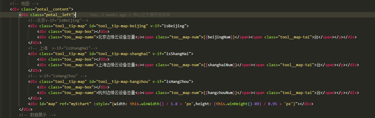 },地图已经高亮,那么对应的弹框是不是也应该出现,来看我写的自定义弹框,设置了三个变量来控制显隐,当滚到对应区域的时候,就让这个弹框出现,其他隐藏,弊端就是这个定位的位置是写死的,如果要求适配各种大屏,那么需要写几套样式,比较复杂。