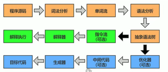 大部分程序代码转换成物理机的目标代码或虚拟机能执行的指令集之前,都需要经过上图中的各个步骤。