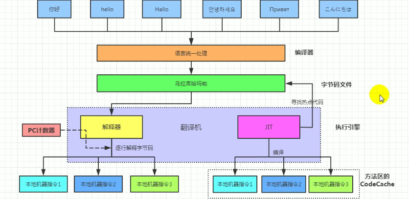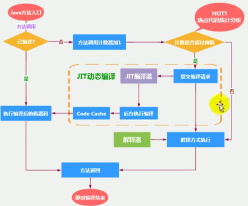 java是半解释、半编译型语言,其中绿色的部分就是解释、浅蓝色的部分就是编译。
