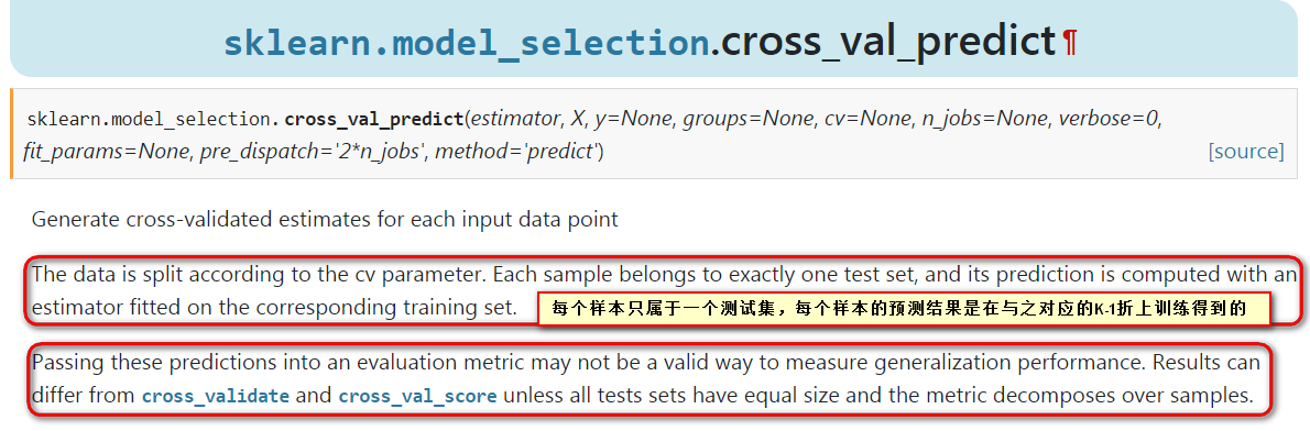 cross_val_predict:分别在K-1上训练模型,在余下的1折上验证模型,并将余下1折中样本的预测输出作为最终输出结果的一部分