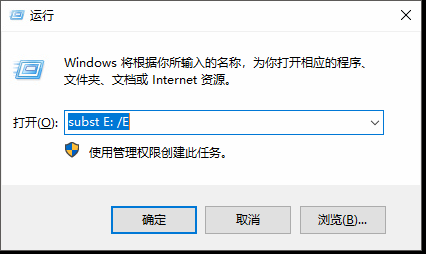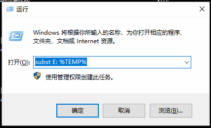 首先 快捷键:WIN+R 打开运行对话框,输入该命令:subst E: %TEMP% 创建一个临时驱动器E盘。