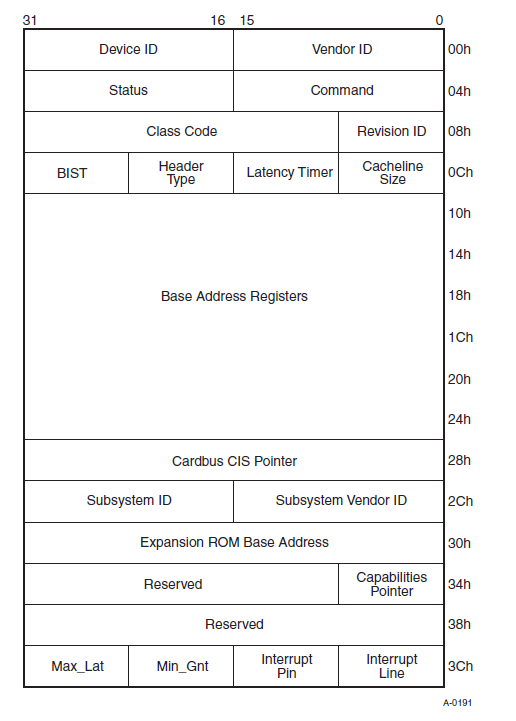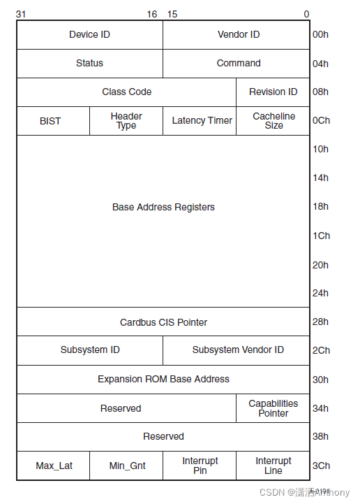 Header Type :指示Header 中从地址10H到3FH区域的内容格式,同时指示该设备是否为多功能设备。