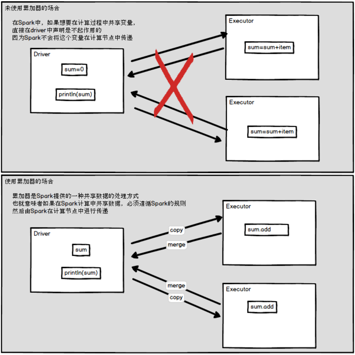 (1)自定义变量在Spark中运算时,会从Driver中复制一份副本到Executor中运算,但变量的运算结果并不会返回给Driver,所以无法实现自定义变量的值改变,一直都是初始值,所以针对这个问题,引入了累加器的概念;