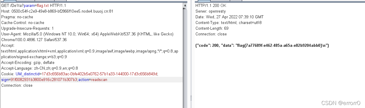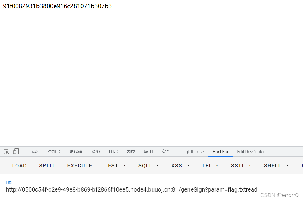 OK,现在我们需要做的事就是给sign找到一个MD5的值绕过checkSign(),因为不知道密匙所以我们可以利用/geneSign,但是action在/geneSign中的值不能修改为‘scan’,而我们要用密匙+param+action,而且我们能控制param的值所以我们赋值给param=flag.txtread,最后得到的MD5就是我们想要的,演示如下:
