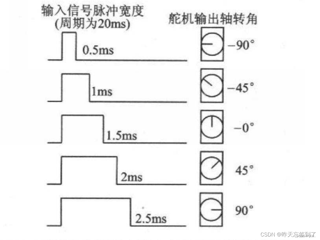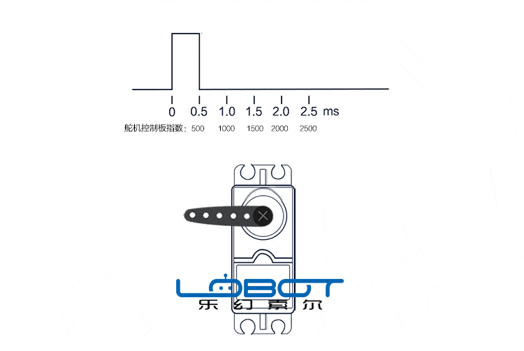 舵机的控制一般需要一个20ms左右的时基脉冲,该脉冲的高电平部分一般为0.5ms-2.5ms范围内的角度控制脉冲部分,总间隔为2ms。以180度角度伺服为例,那么对应的控制关系是这样的: