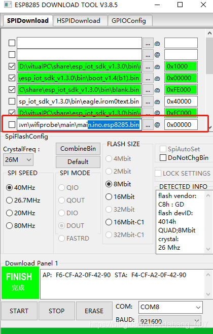 还有esp8285在刷arduino工程导出的bin文件时候,用老的esp tool工具升级失败,换了v3.8.5的版本后就正常了,记录到下图