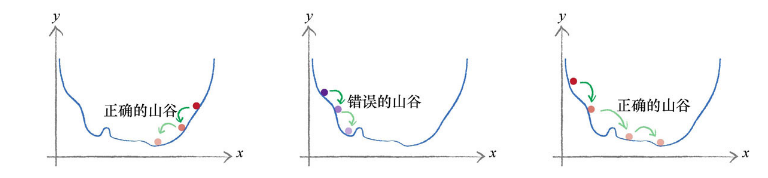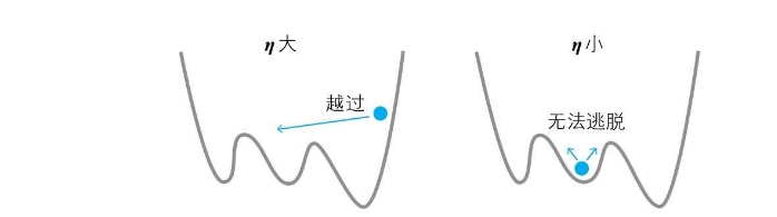 选用合适的学习率,过小无法逃脱 , 过大会在最小值附近震荡。