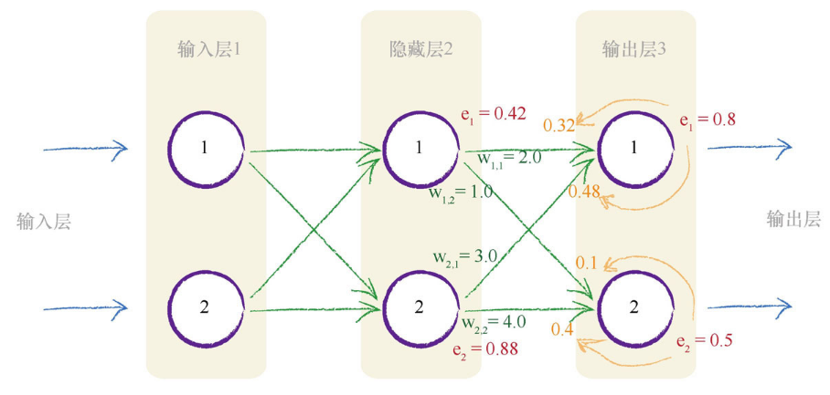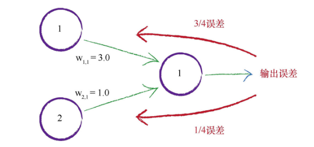 由不同权重产生的 不同比例的误差分配: 可以认为 因为 输出结果 3/4 受节点1 影响 , 1/4 受节点2 输出影响,所以总的输出误差更可能按权重的比例来分配。