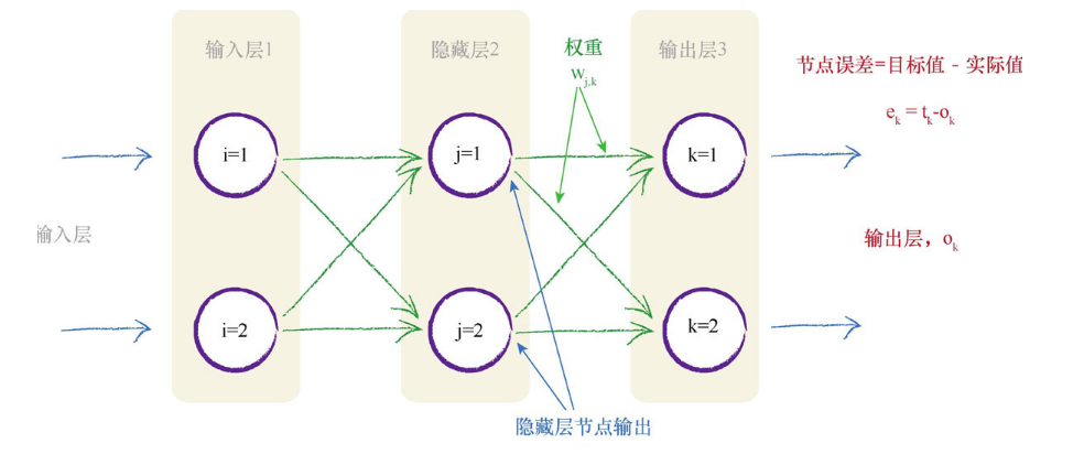 在输出层,我们有来自训练集的目标值 ,所以很容易得到误差,然后根据误差函数,可以求出使误差最小的输出层权重 ,但是隐藏层的误差我们没有定义,因为没有目标值。