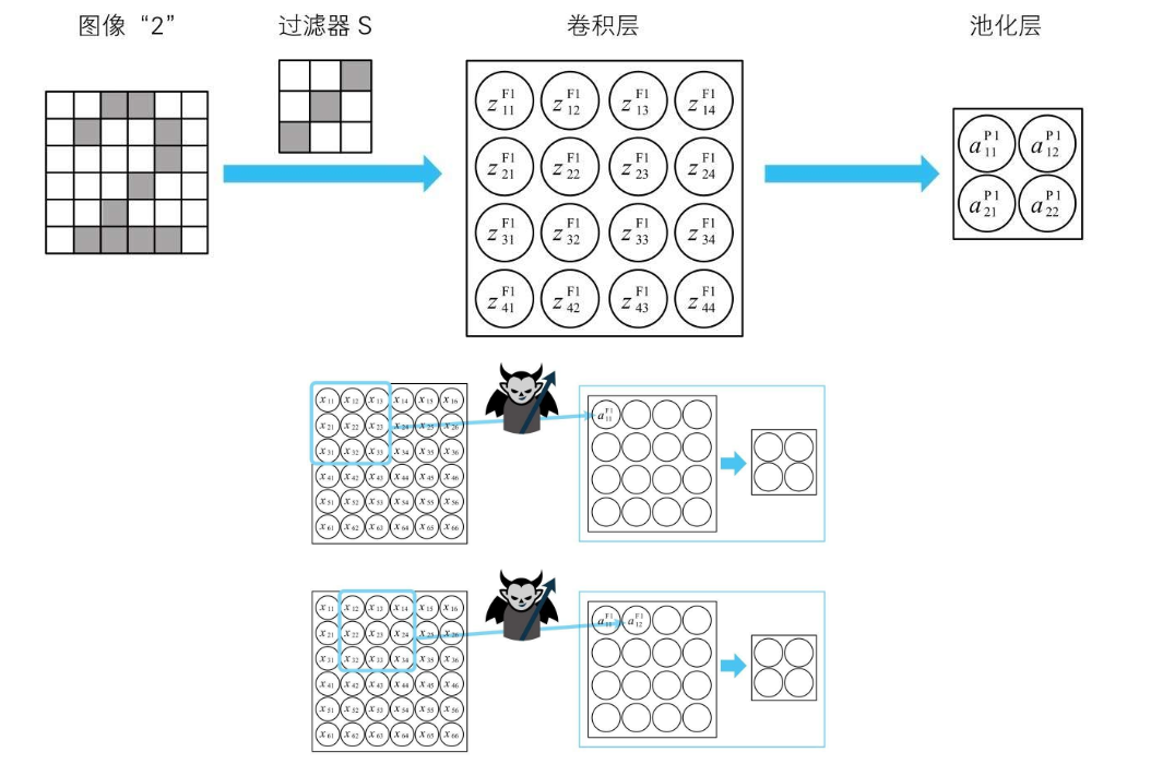 卷积核: 在二维图像处理中,如下图,选定的3x3 大小的 过滤器S , 看作二维向量 W , 输入图片为二维向量 X , 根据感知机中提到的向量内积表示相似性 , 让 向量 W 依次划过整张图片,与选中的区域做内积运算 , 再经过 Sigmoid 函数, 得到 图像中得部分区域 与 过滤器S 得相似程度。卷积层最终反应得是 原始图片中 , 与过滤器S 相似的概率。也就是说过滤器 提取了 原始图片得特征分布。这个过滤器S 就称为卷积核,卷积核通常为5X5 大小 , 常用得卷积核 见图像处理常用卷积核的效果。下图中 得到的卷积层,明显在中间部分的概率比较大 , 因为卷积核 更像 ‘2’ 的中间部位 , ’2‘的 头部也会有不错的概率,因为它部分相似 。