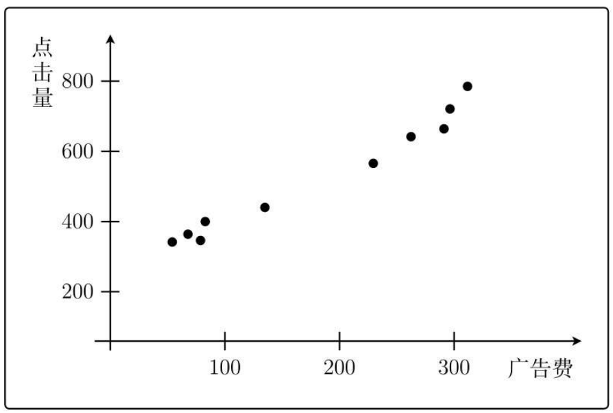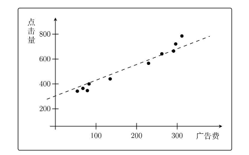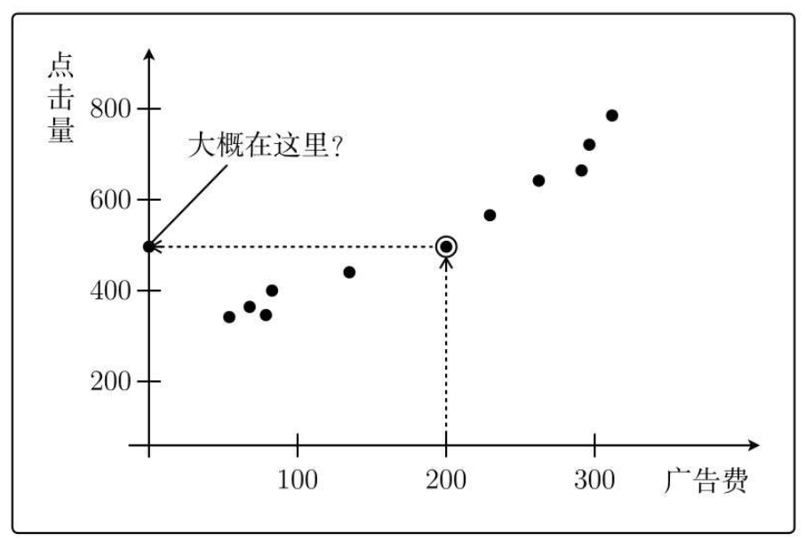 如下图所示,通过采集数据,得到了web网站的点击量与广告费关系图 , 根据这张图,我们能得到广告费为200w的点击量吗?