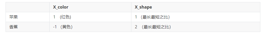 我们如何根据输入的 颜色 和形状 来得到 是 香蕉 还是 苹果 的概率 ? 假设 苹果和香蕉的输入如下表: