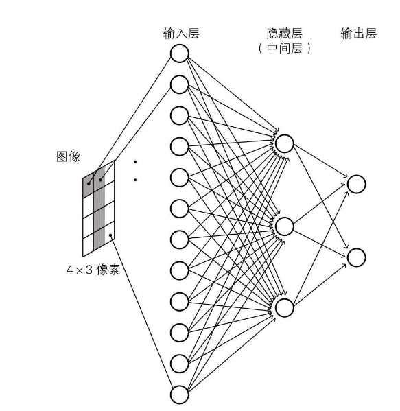 输入层是 像素点 , 这里是二值图片,像素点取值只能0和1,识别 0和1 ,输出层是 0,和 1 的概率, 中间增加一层隐藏层,至于隐藏层的层数和节点个数,需要按实际情况测试。我们同样可以通过向量的相似性来理解这里的权重 。