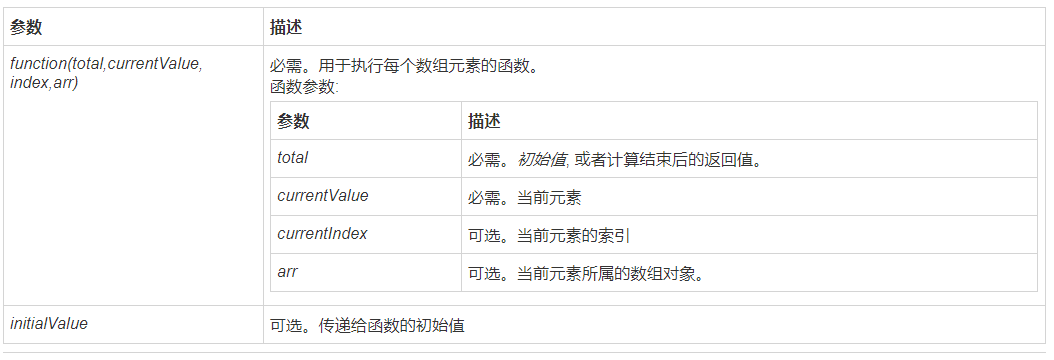 array.reduce(function(total, currentValue, currentIndex, arr), initialValue)