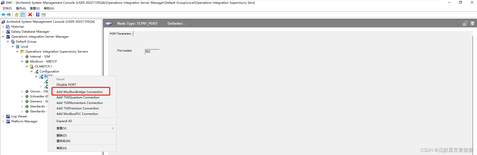 (2)打开SMC后,依次展开“Operations Integration Supervisory Server→Modicon-MBTCP→OI.MBTCP.1→Configuration→PORT”。