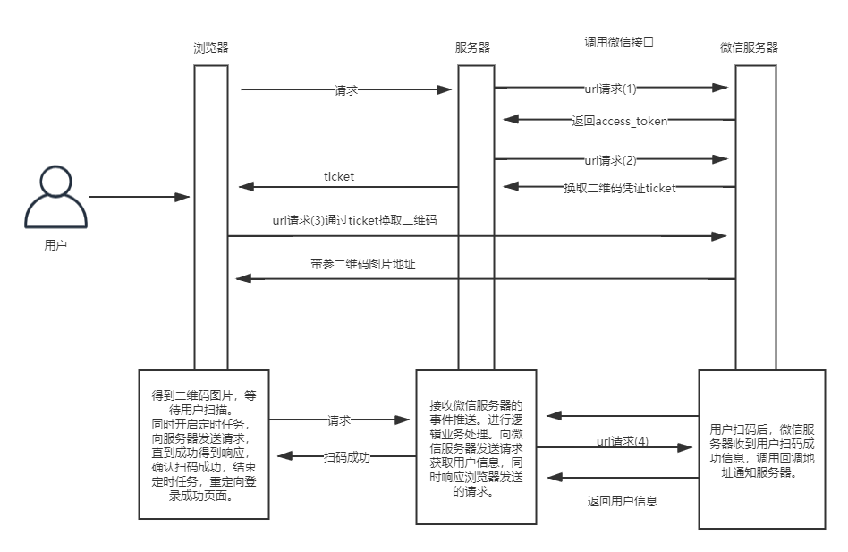 由上图可分析:可以在浏览器端在用户获取二维码并扫码后,启动定时任务。间断的向服务器发送请求,当服务器收到微信服务器的通知并确定用户已经扫码后,将信息返回给浏览器,浏览器