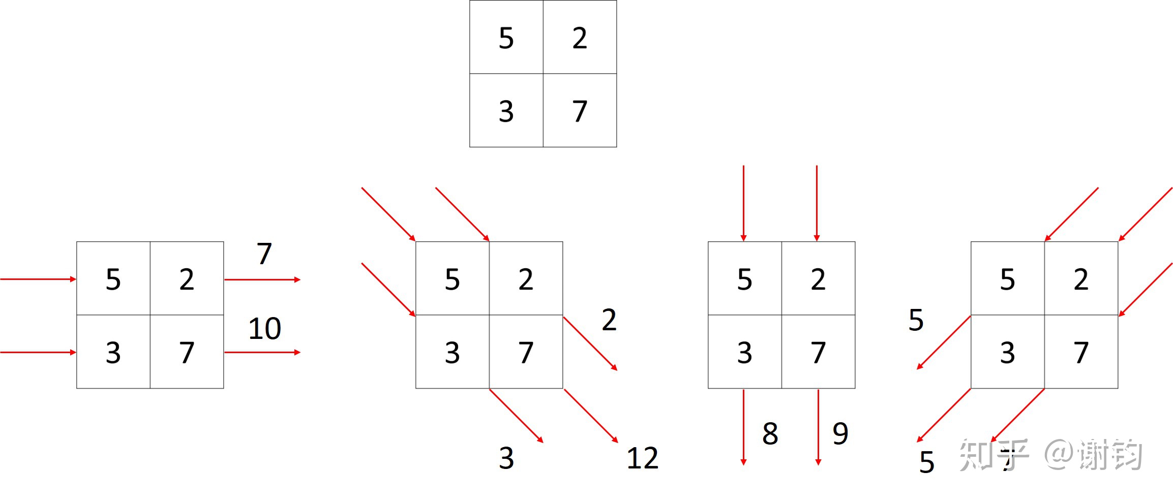 下面以一个具体的例子来解释说明一下上述现象。假设人体组织只包含四个部分,肝脏、水分、骨头、肾即为一个2*2的矩阵,X射线经过对应组织的衰减系数分别是5、2、3、7;然后X射线分别是分别从左、左上、上、右上四个角度进行投影成像,则下图第二行分别是从不同角度摄入时得到的对应衰减输出;