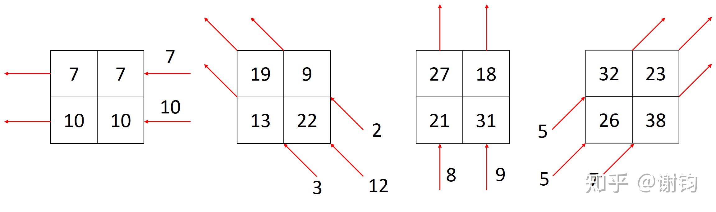 在获得X射线从不同角度摄入时产生的衰减输出,逆投影法可以被用来恢复原始人体不同组织中衰减系数。具体而言如下图所示,即我们逐步从右、右下、下、左下四个角度对一个空二维矩阵进行投影成像,经过逆投影法之后重构人体组织结构的衰减系数为矩阵4所示。