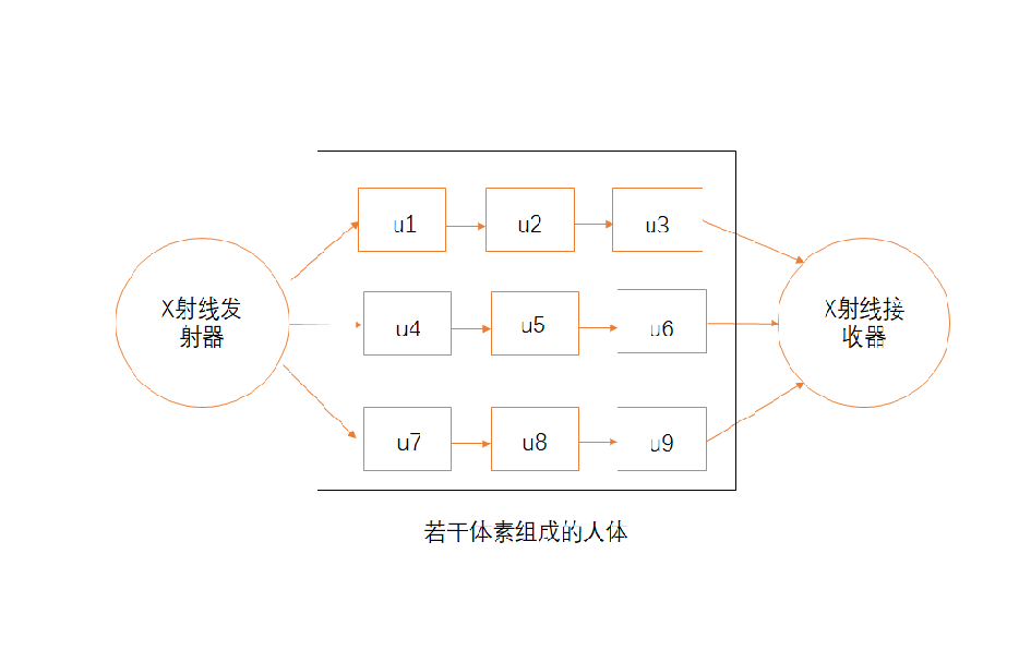 CT图像重建的目的是如何构建一套算法实现将不同角度进入人体之后的X光线衰减的变化转化成人体的3D图像。因为本人的研究领域并不是医学图像成像,因此对这个领域并不是很了解,所以根据知乎上一篇文章来简单介绍如何根据逆投影法来恢复人体不同组织的衰减值。在1.1.1节,我们知道X射线之所以能使人体组织在荧屏上形成影像,主要是由于人体不同组织之间有密度和厚度的差别,当X线透过人体不同组织结构时,被吸收的程度不同,所以到达荧屏上的X线量即有差异。然后我们将这个过程给公式化,既是假设X射线的初始强度是,某种物质X的长度为为L,X射线衰减因子是μ,则X射线穿过该物质后的强度为