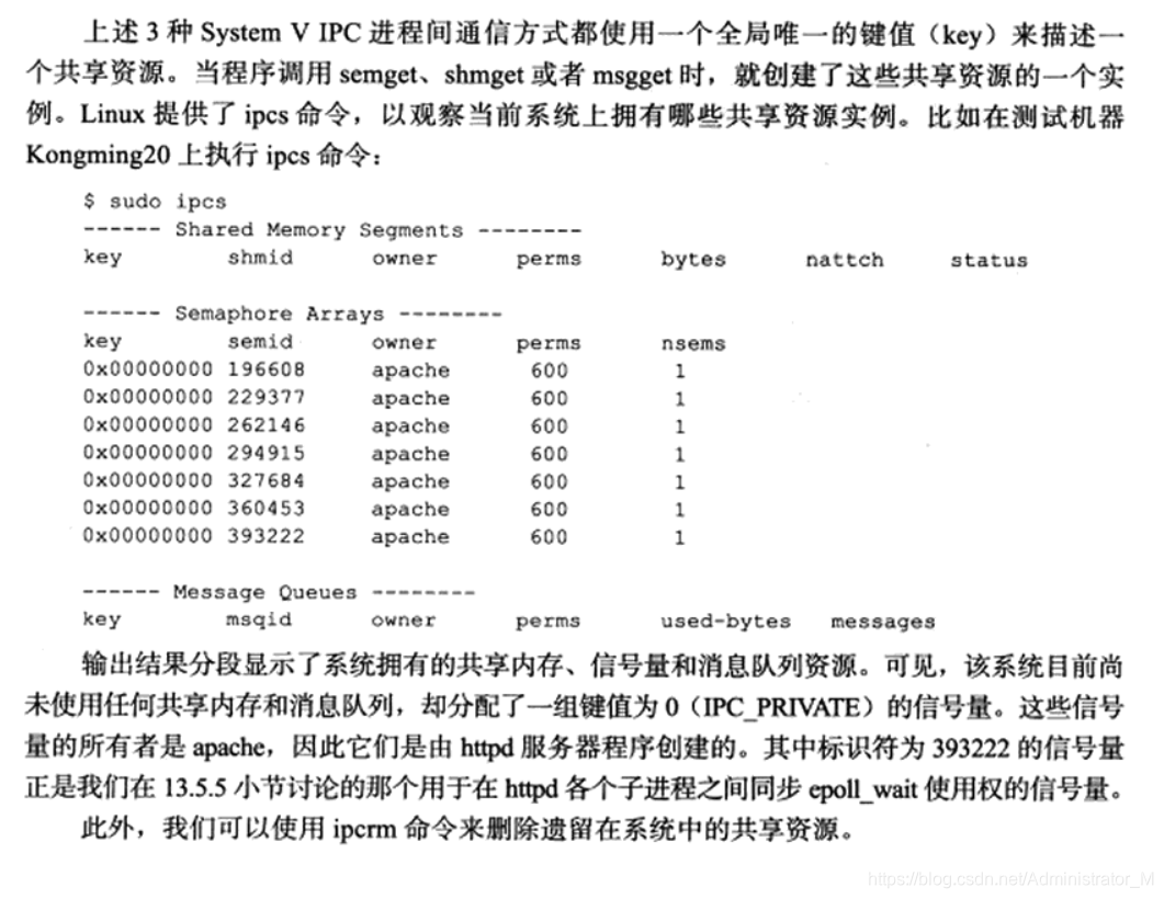 共享内存是最高效的IPC机制,因为它不涉及进程之间的任何数据传输。这种高效率带来的问题是,我们必须使用其他辅助手段来同步进程对共享内存的访问,否则会产生竞态条件。因此,共享内存通常和其他进程间通信一起使用