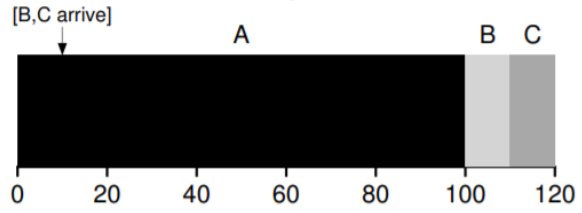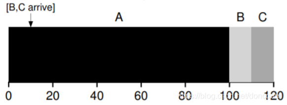 根据此图和公式我们不难算出每个任务的平均周转时间为(10+20+30)/3=20。但是现在是在每个任务的运行时间都相同的假设下。当我们打破这个规则,会发生什么呢(比如同样的到达顺序但是A的执行时间比B、C两个任务加起来都长)?
