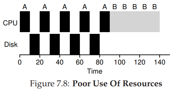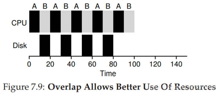 从上图可以看出不对阻塞时间进行利用的话会导致效率低下。所以我们根据STCF算法(之所以能选择STCF的原因也是因为条件5:假设知到每个进程的运行时间。试想一下如果不提前知到任务的运行时间还能根据A任务运行时间的特点来选择STCF算法吗?肯定不行,因为并不知道A是否有I/O操作)来构建调度器。这里我们要把每个子任务看做为1个长度为10毫秒的任务(他们实际上还是一个任务)。根据STCF会让运行时间最短的任务先运行的特点,第一次一会选择A任务,因为子任务为10毫秒比B小。在第一个子任务被阻塞后,由于只剩下了B任务,所以在A阻塞期间调度器就可以切换至B任务运行。注意不要犯糊涂可以切换到另一个A的子任务,这些子任务是一个整体!所以当那些交互式任务发起I/O被阻塞时,CPU可以让其他资源敏感的任务来占用CPU运行,进而提高CPU的利用率: