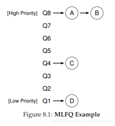 所以MLFQ的关键是如何设置优先级。MLFQ并不是给每个任务一个固定的优先级,相反MLFQ会根据每个任务的观察到的行为(observed behavior)来调整优先级。
