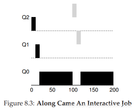 在100ms的时候,B任务到来,放在Q2中。在B用完了两次时间片即将放入优先级最低的队列时完成了任务,A继续运行。从上图中我们可以看出这种算法的主要目标之一:由于不知道一个新来的任务是计算密集型的还是交互式的,所以直接假设任何一个任务最开始都是交互式的,放在优先级最高的队列。这样的好处就是如果他真的是交互式任务那么该任务可以立即运行保证用户体验,计算密集型的任务慢慢降低优先级即可。