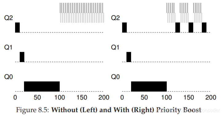 • 规则 5: 在某个时间段S后,把所有的任务全部移动到优先级最高的队列(最顶部的队列)。