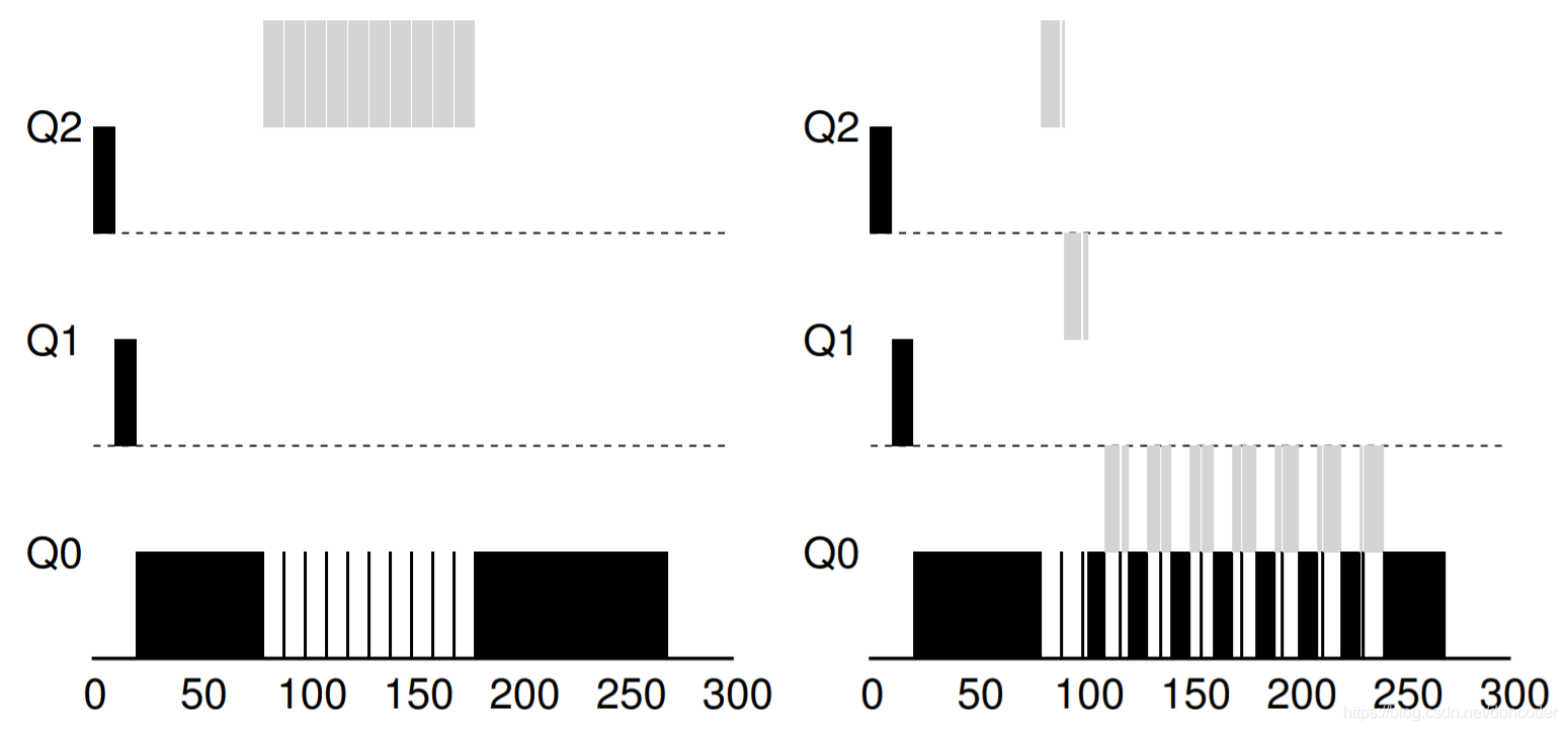 下面左图为使用4a、4b规则的调度器,可以看出聪明的黑客可以很轻松的让灰色任务独占CPU使用权。而在右图中,可以看出灰色任务即使在运行中发出了I/O在时间运行完后优先级也被降低了,这样就不可能使它独占CPU使用权。