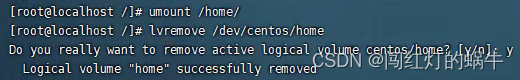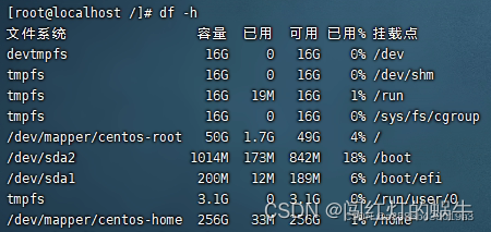 可见,当前有1.6T的空间挂载在了 /home 路径下,而根目录 / 下则只有50G。因此,希望将 /home 路径下的空间扩充到根目录下。
