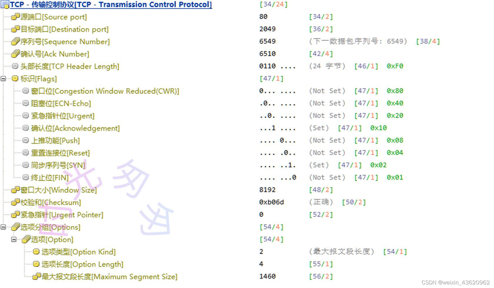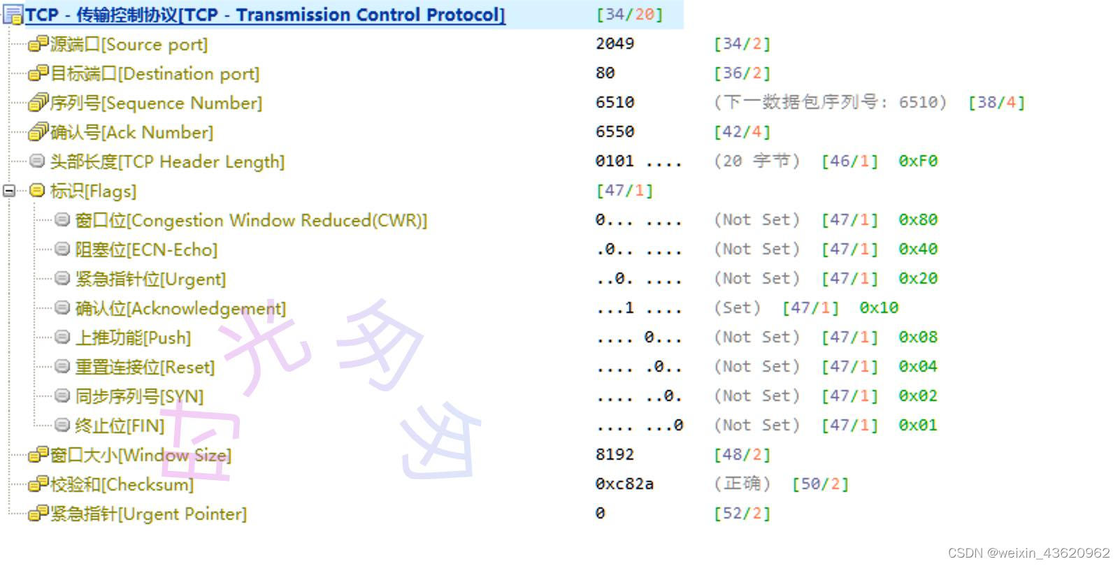 上面是第二个,当Server服务器收到数据包后就回复一个seq=6549(新的序列号),ack=6510(确认收到上一个数据包),标识位中SYN、ACK置位的数据包发送给Client客户端。