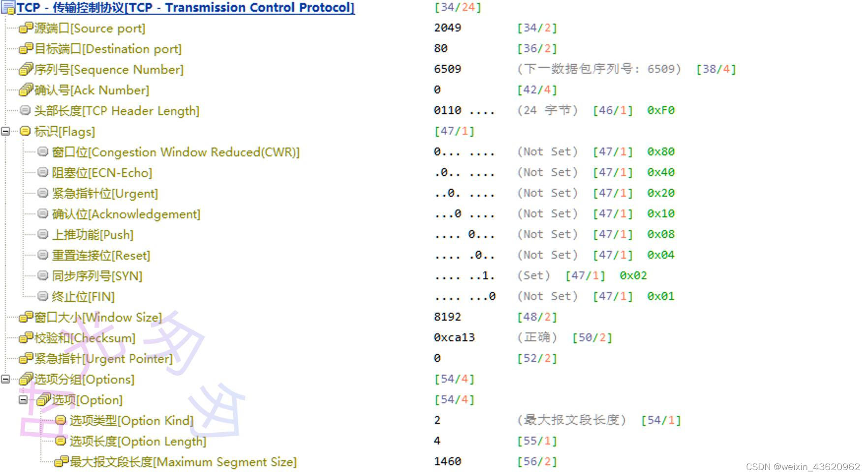 这就是第一个数据包TCP的详细信息,通过图片我们可以看到三次握手先是客户端发起连接,发送一个seq= 6509(开始的序列号),以及标识位中SYN置位的一个数据包给到Server服务器。