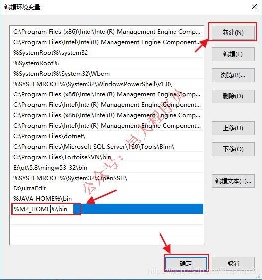 12、 在弹出的对话框中点击新建按钮,在最下面一行中填入%M2_HOME%\bin,然后点击确定