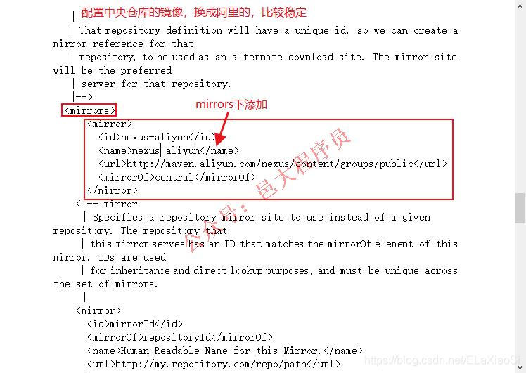 16、 配置中央仓库的镜像,换成阿里的,比较稳定,不然时候下个包要等很久。也是在刚才打开的settings.xml中,找到mirrors标签,在里面添加如下内容即可