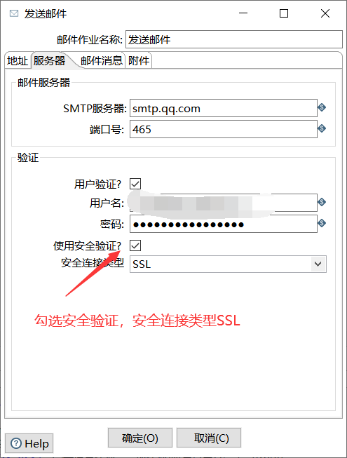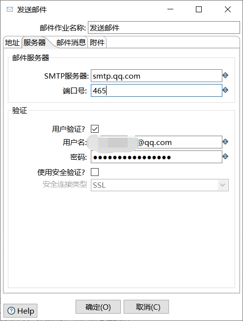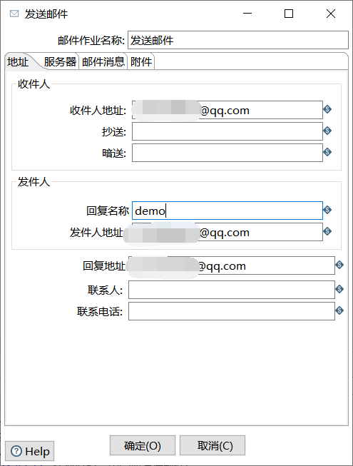 3.添加发送邮件作业项,设置收件人和发件人信息,此处必须为实际可用的邮箱地址,可以使用自己的邮箱,也可以申请其他邮箱。邮箱类型不限(此处以QQ邮箱为例)。