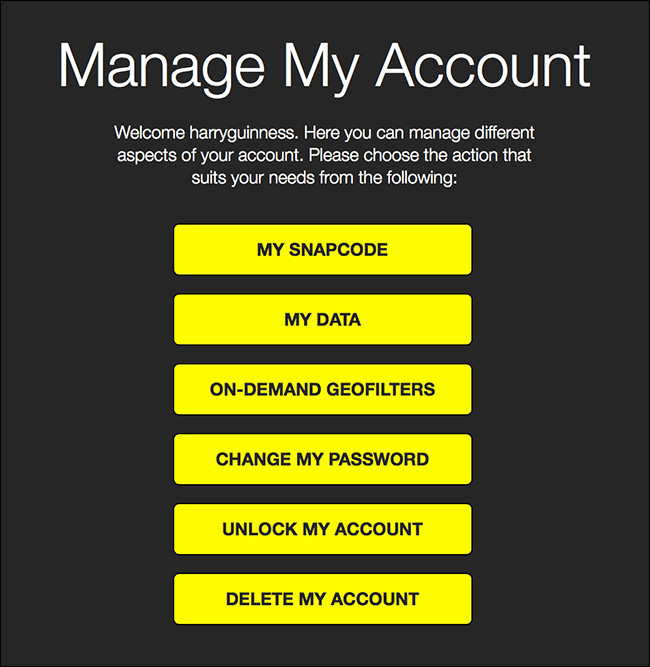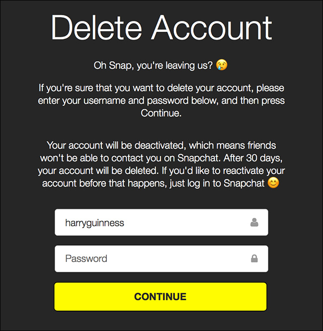 无法从Snapchat应用中停用您的Snapchat帐户。 相反,您需要访问Snapchat的帐户管理网站 。 但是,您可以在智能手机的浏览器上执行所有这些操作。 单击上面的链接,输入您的Snapchat登录详细信息,然后单击登录。