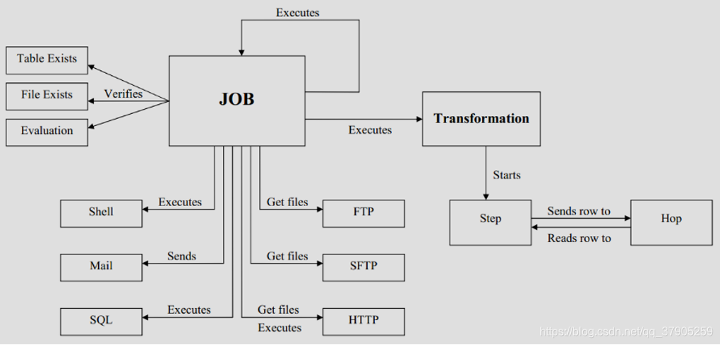 - Kettle中有两种脚本文件,transformation和job,transformation完成针对数据的基础转换,job则完成整个工作流的控制。