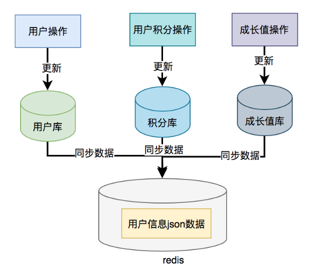 那么,我们能不能把数据冗余一下,把用户信息、积分和成长值的数据统一存储到一个地方,比如:redis,存的数据结构就是用户信息查询接口所需要的内容。然后通过用户id,直接从redis中查询数据出来,不就OK了?